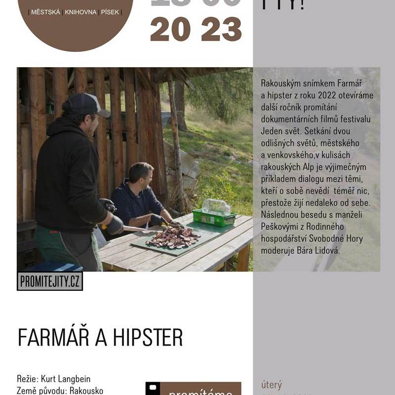 Rakouským snímkem Farmář a hipster z roku 2022 otevíráme další ročník promítání dokumentárních filmů festivalu Jeden svět. Setkání dvou odlišných světů, městského a venkovského, v kulisách rakouských Alp je výjimečným příkladem dialogu mezi těmi, kteří o sobě nevědí téměř nic, přestože žijí nedaleko od sebe. Následnou besedu moderuje Bára Lidová.