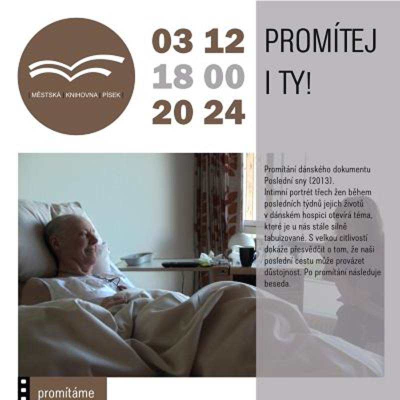 Promítání dánského dokumentu Poslední sny (2013). Intimní portrét třech žen během posledních týdnů jejich životů v dánském hospici otevírá téma, které je u nás stále silně tabuizované. S velkou citlivostí dokáže přesvědčit o tom, že naši poslední cestu může provázet důstojnost. Po promítání následuje beseda.