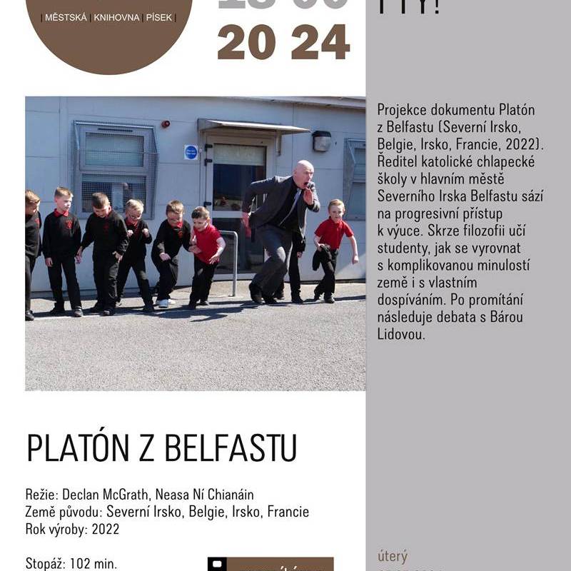 Projekce dokumentu Platón z Belfastu (Severní Irsko, Belgie, Irsko, Francie, 2022). Ředitel katolické chlapecké školy v hlavním městě Severního Irska Belfastu sází na progresivní přístup k výuce. Skrze filozofii učí studenty, jak se vyrovnat s komplikovanou minulostí země i s vlastním dospíváním.