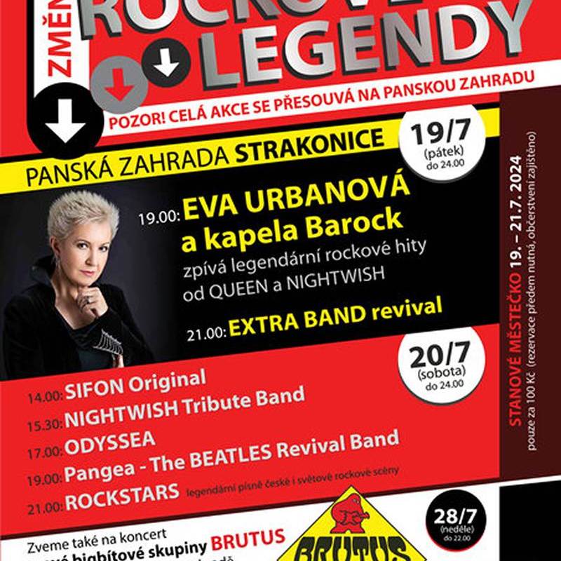Přijeďte si užít skvělou rockovou muziku a legendární české i světové hity do Letního kina Strakonice a Panské zahrady na festival Rockové legendy. Největší hvězdou festivalu je EVA URBANOVÁ, která vás nadchne sérií hitů od QUEENů a NIGHTWISH. Následují nezapomenutelné písně od EXTRA Bandu revival s Jaroslavem Soukupem, druhý den ODYSSEA, Nightwish Tribute Band, nejznámější hity Beatlemánie zažijete s The BEATLES Revival Band Pangea, nebude chybět ani Sifon Original, ROCKSTARS a Milan Goťák Fiala. Na závěr festivalu, s odstupem jednoho týdne, si přijeďte užít pravou 4 hodinovou bigbítovou zábavu s BRUTUSEM.