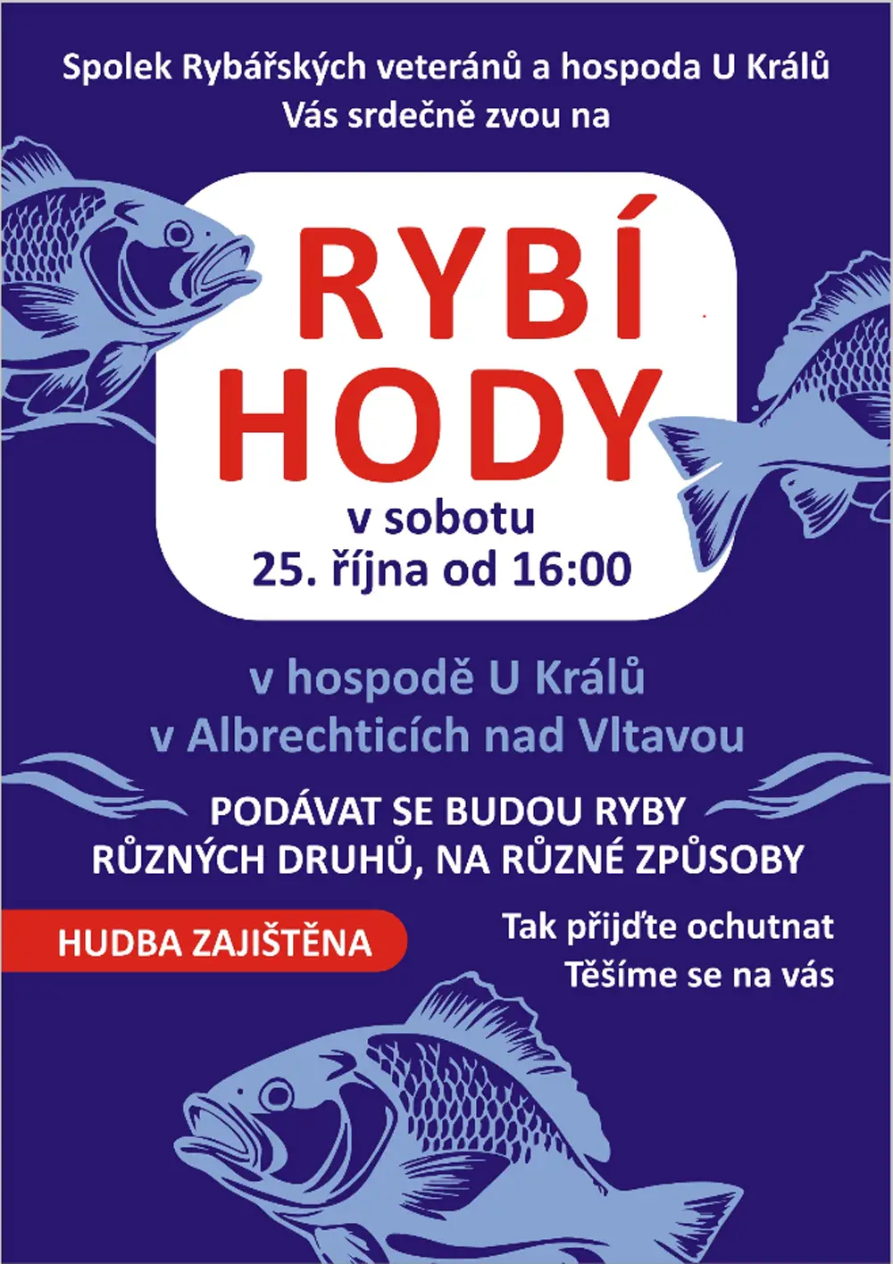 Spolek Rybářských veteránů Vás srdečně zvou na tradiční rybí hody, které se konají v sobotu 25. října od 16:00 v hospodě U Králů v Albrechticích nad Vltavou. Podávat se budou ryby různých druhů na různé způsoby a k dobrému jídlu nebude chybět ani hudba.