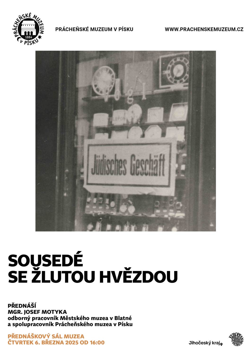 Blížící se 80. výročí konce druhé světové války přináší spoustu otázek. Mezi ně také patří ta, co se stalo s těmi, kteří se již nevrátili, které nepotkáváme. Zejména přitom myslíme na naše sousedy, kteří se museli prokazovat žlutou hvězdou. Považovali se vůbec za Židy? Jaké byly jejich osudy a možnosti v protektorátu? Jak si je dnes v Písku připomínáme? To jsou hlavní okruhy otázek, jimiž se během přednášky bude zabývat místní znalec židovské problematiky Mgr. Josef Motyka, odborný pracovník Městského muzea v Blatné a spolupracovník Prácheňského muzea v Písku. Koná se ve čtvrtek 8. března od 16 hodin v přednáškovém sále Prácheňského muzea v Písku.