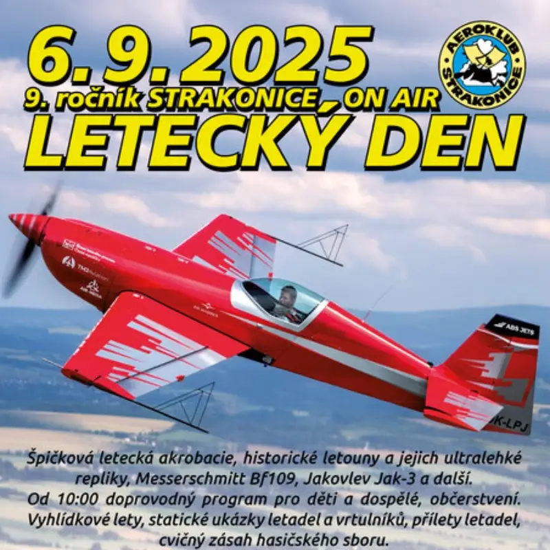 6. září 2025 | letiště Strakonice | vstupné: 250 Kč, děti do 15 let v doprovodu rodičů zdarma | parkovné: 50 Kč