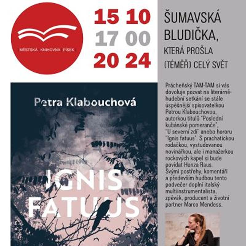 Prácheňský TAM-TAM si vás dovoluje pozvat na literárně-hudební setkání se stále úspěšnější spisovatelkou Petrou Klabouchovou, autorkou titulů “Poslední kubánské pomeranče”, “U severní zdi” anebo hororu “Ignis fatuus”. Svými postřehy, komentáři a především hudbou tento podvečer doplní italský multiinstrumentalista, zpěvák, producent a životní partner Marco Mendess.