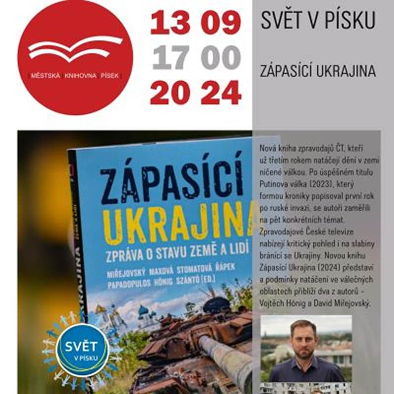 Reportéři ČT Vojtěch Hönig a David Miřejovský představí novou knihu Zápasící Ukrajina (2024). Zároveň přiblíží podmínky natáčení ve válečných oblastech.Pozvánka knihovny