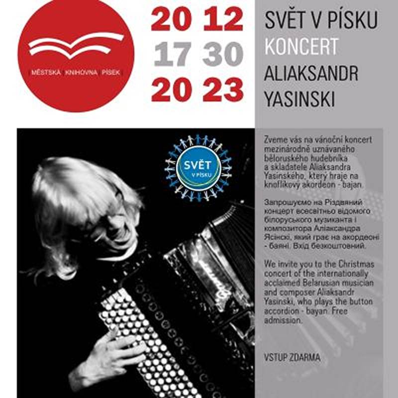Zveme vás na vánoční koncert mezinárodně uznávaného běloruského hudebníka a skladatele Aliaksandra Yasinského, který hraje na knoflíkový akordeon (bajan). Kromě širokého repertoáru hudby pro bajan (klasické, jazzové, argentinského tanga, francouzského šansonu) je také autorem a interpretem vlastních písní. Vstup zdarma.