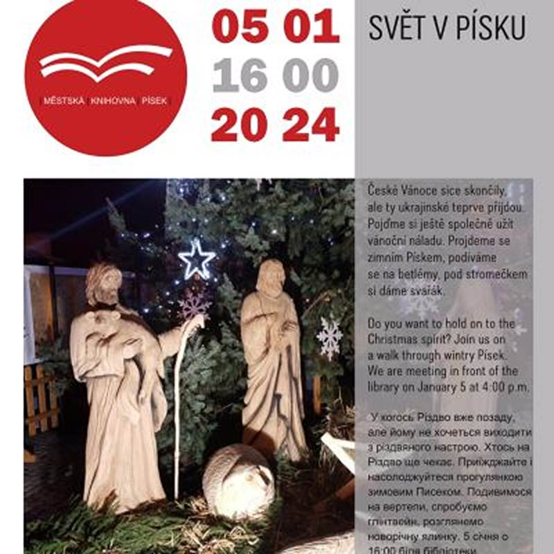 České Vánoce sice skončily, ale ty ukrajinské teprve přijdou. Pojďme si ještě společně užít vánoční náladu. Projdeme se zimním Pískem, podíváme se na betlémy, pod stromečkem si dáme svařák.