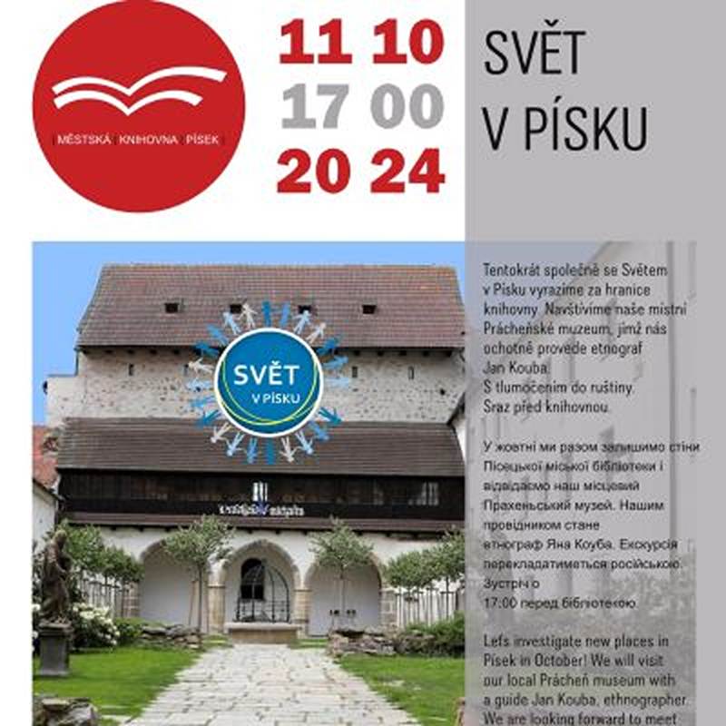 Společná vycházka se Světem v Písku. Tentokrát navštívíme místní Prácheňské muzeum, jímž nás provede etnograf Jan Kouba. S tlumočením do ruštiny. Sraz před knihovnou.