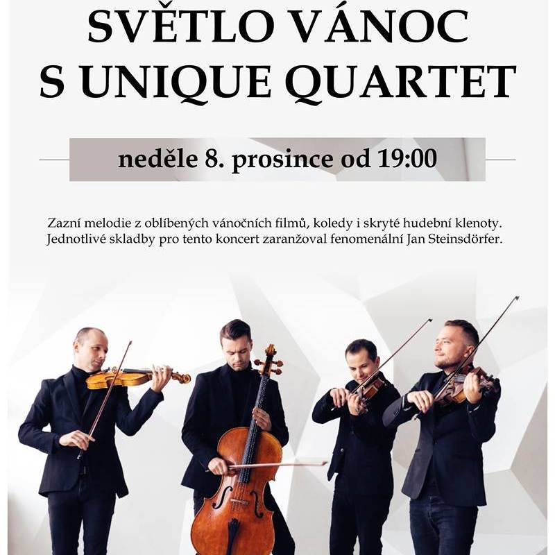 Koncert Světlo Vánoc se smyčcovým kvartetem Unique Quartet je nezapomenutelným zážitkem a krásným zastavením v době adventu. Zazní skladby z oblíbených vánočních filmů, koledy i skryté hudební klenoty. Unique Quartet spojí známé i méně známé melodie do kouzelné vánoční mozaiky, která naplní atmosféru večera i vaše srdce duchem Vánoc. Přijďte si užít výjimečný večer plný překrásných svátečních tónů, které ve Vás budou znít po celý adventní čas a naladí Vás na nadcházející vánoční svátky. Jednotlivé skladby pro tento koncert zaranžoval fenomenální Jan Steinsdörfer (Ewa Farna, Chinaski).