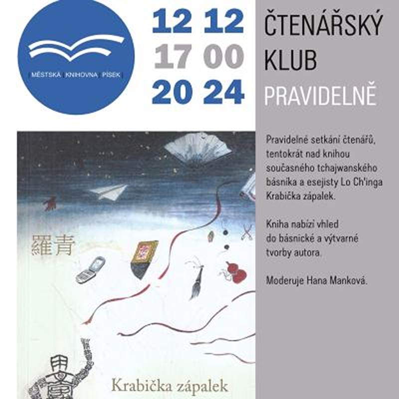 Pravidelné setkání čtenářů, tentokrát nad knihou současného tchajwanského básníka a esejisty Lo Ch’inga Krabička zápalek. Kniha nabízí vhled do básnické a výtvarné tvorby autora. Moderuje Hana Manková.