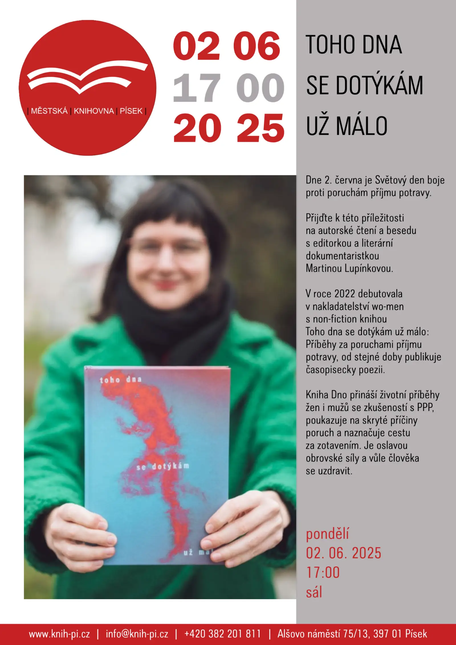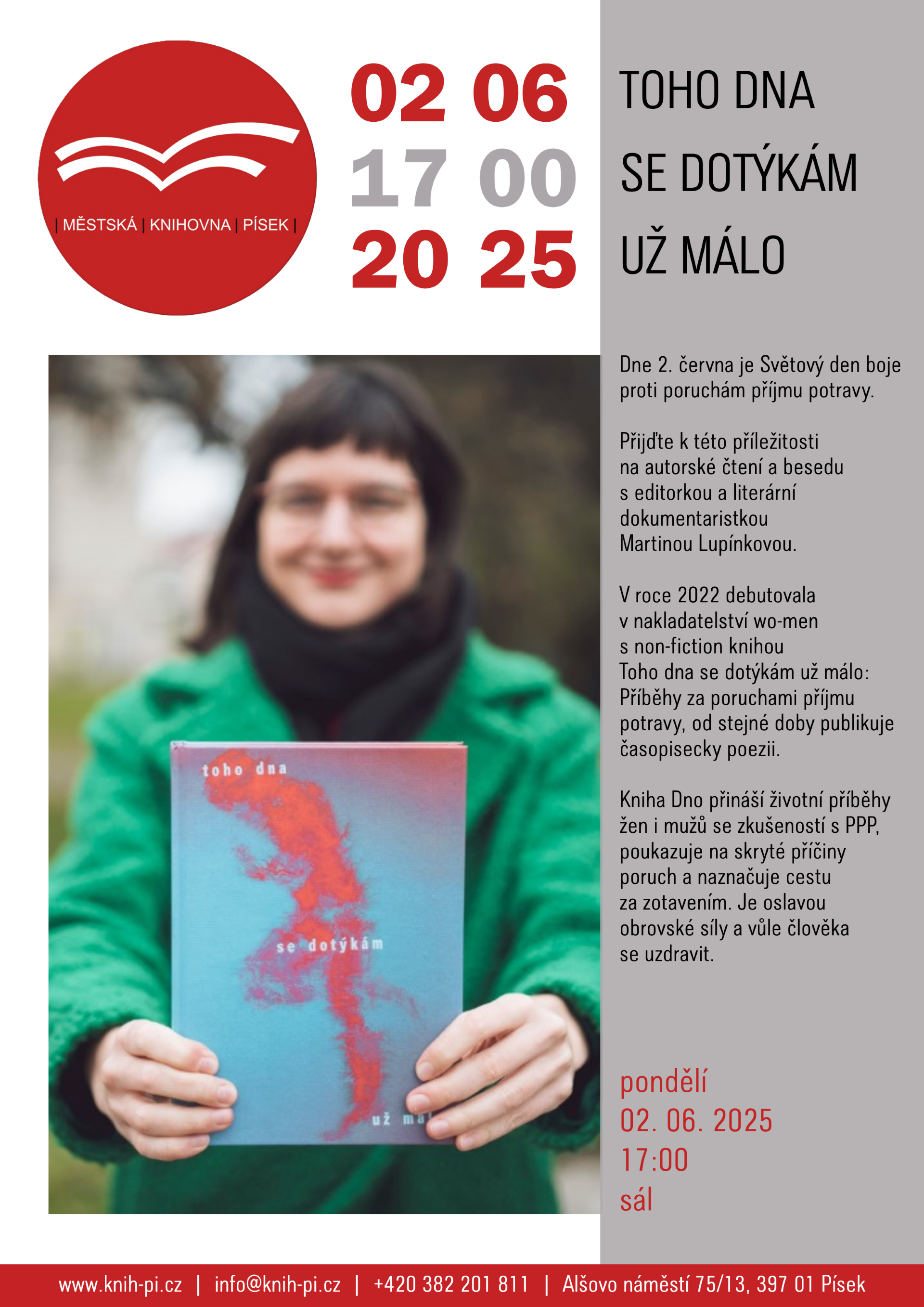 Dne 2. června je Světový den boje proti poruchám příjmu potravy. Přijďte k této příležitosti na autorské čtení a besedu s editorkou a literární dokumentaristkou Martinou Lupínkovou. V roce 2022 debutovala v nakladatelství wo-men s non-fiction knihou Toho dna se dotýkám už málo: Příběhy za poruchami příjmu potravy, od stejné doby publikuje časopisecky poezii. Kniha Dno přináší životní příběhy žen i mužů se zkušeností s PPP, poukazuje na skryté příčiny poruch a naznačuje cestu za zotavením. Je oslavou obrovské síly a vůle člověka se uzdravit.