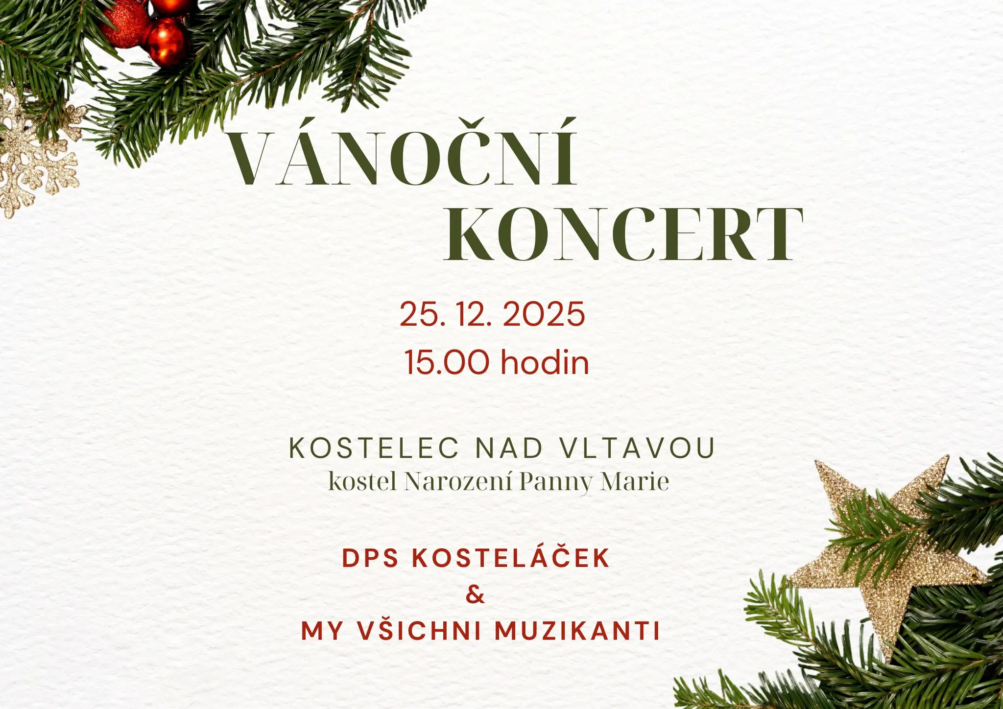 Srdečně vás zveme na náš tradiční Vánoční koncert, který se uskuteční 25. 12. od 15:00 v kostele Narození Panny Marie v Kostelci nad Vltavou.