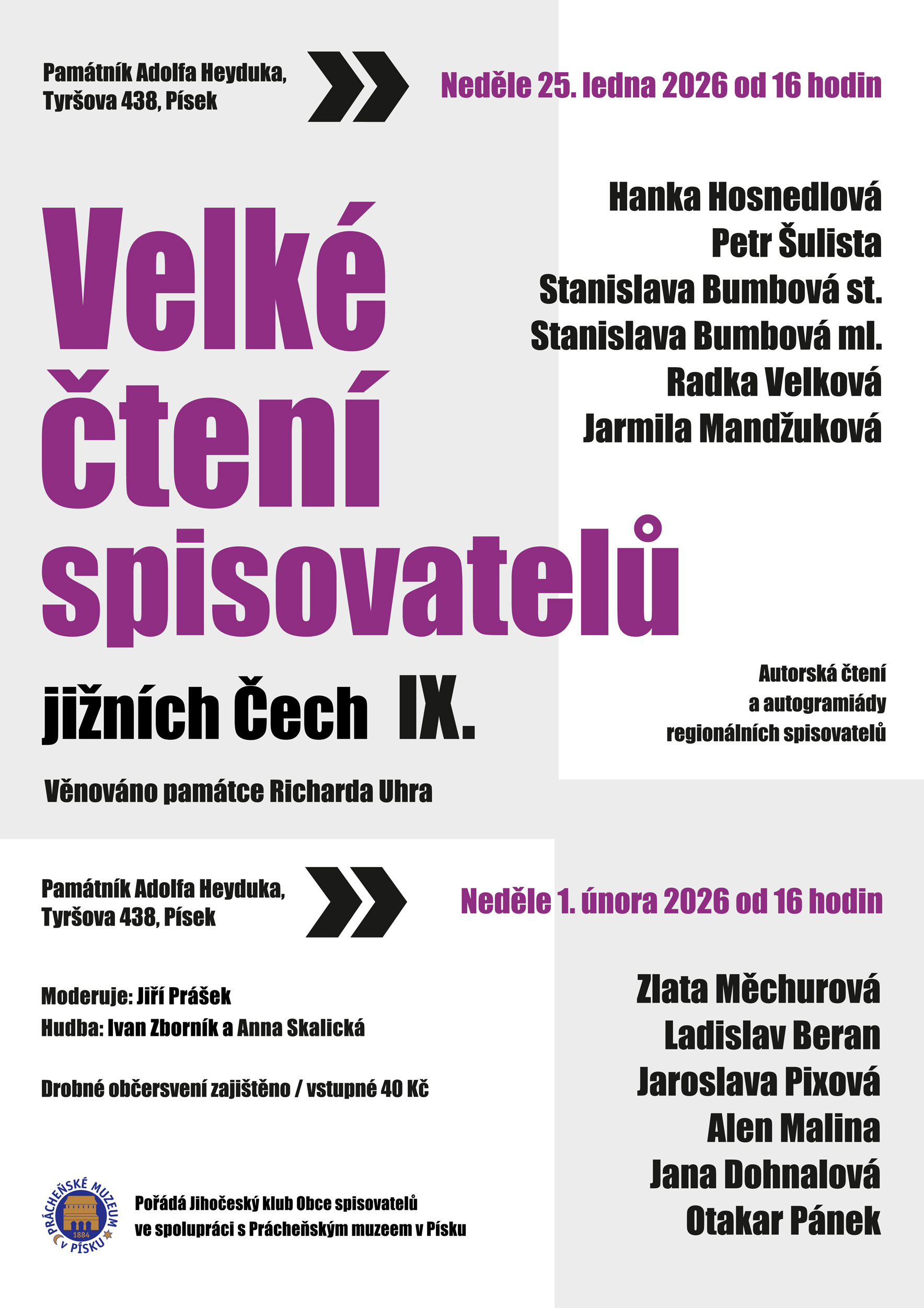Heydukův památník sice zůstane v roce 2026 pro veřejnost uzavřený z důvodu plánované rekonstrukce, ale na přelomu ledna a února zde ještě proběhnou dvě čtení spisovatelů jižních Čech. Akce se koná již podeváté a půjde o dvě po sobě jdoucí neděle (25. 1. a 1. 2.).