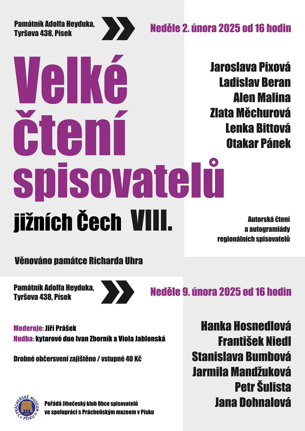 Již osmé setkání jihočeských spisovatelů se koná začátkem února v Památníku Adolfa Heyduka. První dostaveníčko literátů u Heyduků připadá na neděli 2. února od 16 hodin, kdy ze svých knih budou číst Jaroslava Pixová, Ladislav Beran, Alen Malina, Zlata Měchurová, Lenka Bittová a Otakar Pánek. O týden později, tedy opět v neděli 9. února, do Tyršovy ulice dorazí Hanka Hosnedlová, František Niedl, Stanislava Bumbová, Jarmila Mandžuková, Petr Šulista a Jana Dohnalová. Obě čtení moderuje Jiří Prášek, hudební doprovod bude v podání Ivana Zborníka a Violy Jablonské.