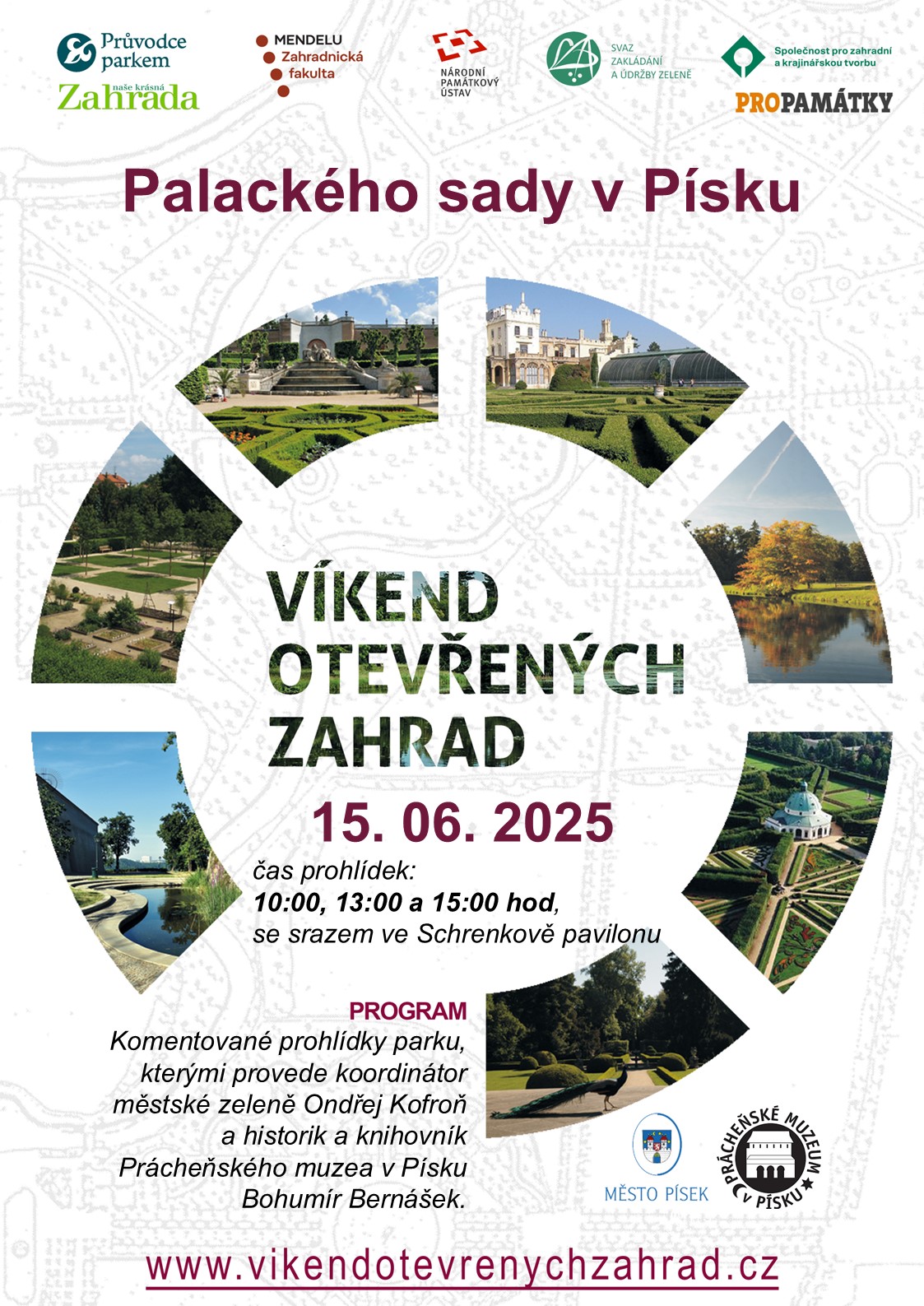 Město Písek se letos k akci připojí, a to se svým nejstarším, největším a nejnavštěvovanějším městským parkem, s Palackého sady. V rámci Víkendu otevřených zahrad budou v parku probíhatv neděli 15. června komentované prohlídky, a to od 10:00, 13:00 a 15:00 hodin (pozor, vzhledem ke spojení akce s městskými slavnostmi, v posunutém termínu než je celostátní akce!), se srazem ve Schrenkově pavilonu. Prohlídkami provede koordinátor městské zeleně Ondřej Kofroň, který návštěvníkům ukáže staré a hodnotné stromy, nové výsadby, ale i květinovou výzdobu. Vysvětlí též koncepci ošetřování dřevin a nechá nahlédnout do možného budoucího vývoje parku. Během prohlídek jej bude doprovázet zástupce Prácheňského muzea v Písku, historik a knihovník Bohumír Bernášek. Ten ve výkladu seznámí návštěvníky se založením parku a s jeho historickým vývojem. Ukáže jim i staré fotografie a nezapomene ani na zajímavé historky a souvislosti s ním spojené.