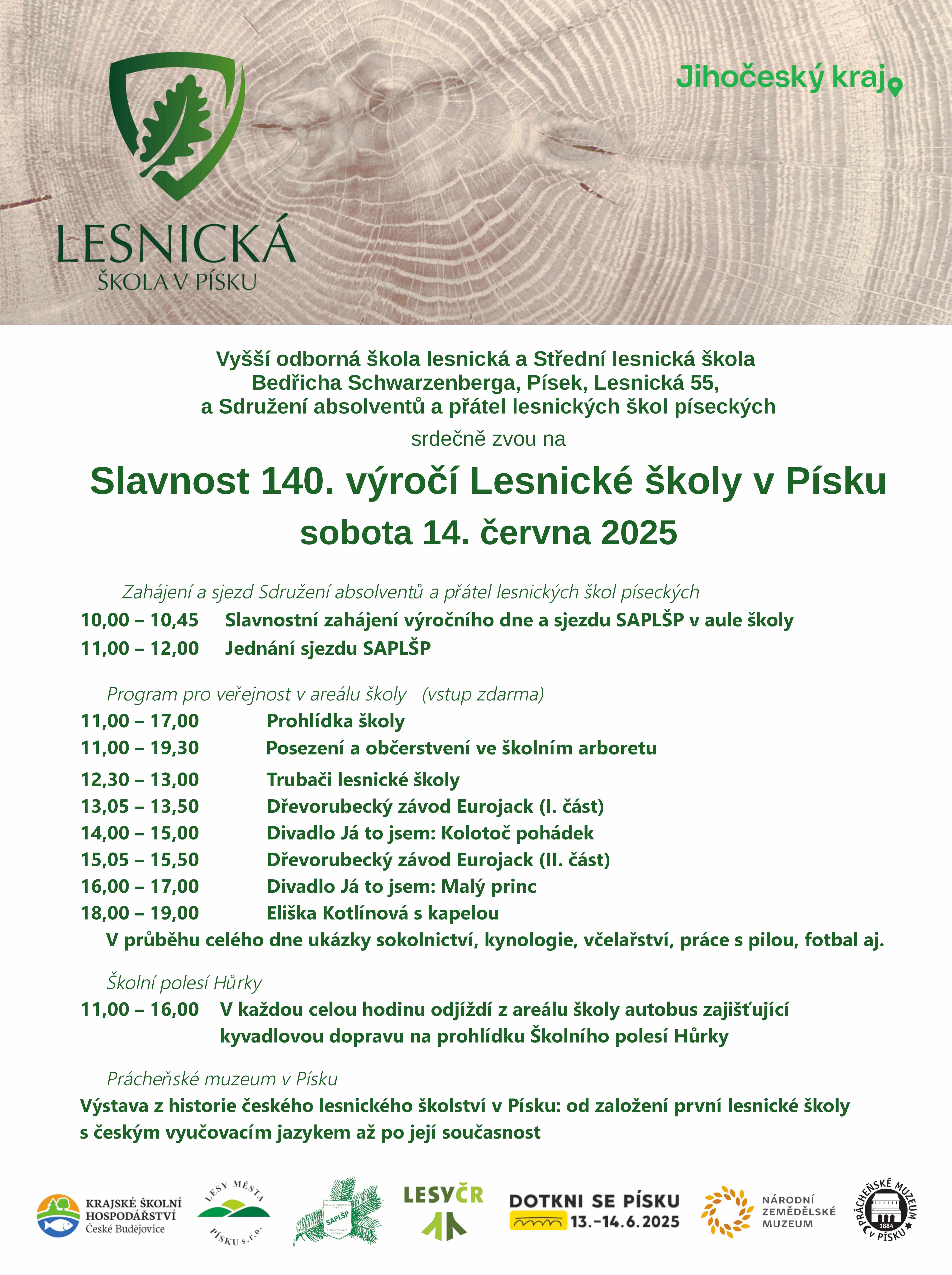 14. června 2025 se zapojí Lesnická škola Písek, která v rámci oslav 140 let školy otevře své arboretum veřejnosti, a to s doprovodným celodenním programem