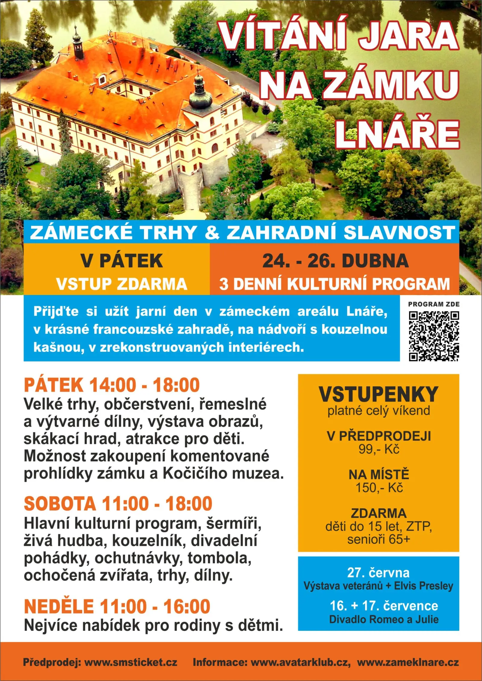 Zveme vás na slavnost Vítání jara do zámku Lnáře, která se koná v krásném prostředí francouzské zahrady, na nádvoří s magickou kašnou, v zámeckých chodbách. Prostor zaplní stánky a kulturní program, vystoupení, občerstvení, relaxační zóna u bazénu a dětský koutek se skákacím hradem. Budete si moci prohlédnout i interiéry zámku v komentované prohlídce nebo Muzeum koček (samostatné vstupné).