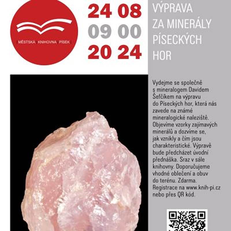Vydejme se společně s mineralogem Davidem Šefčíkem na výpravu do Píseckých hor, která nás zavede na známé mineralogické naleziště. Objevíme vzorky zajímavých minerálů a dozvíme se, jak vznikly a čím jsou charakteristické. Výpravě bude předcházet úvodní přednáška. Sraz v sále knihovny.