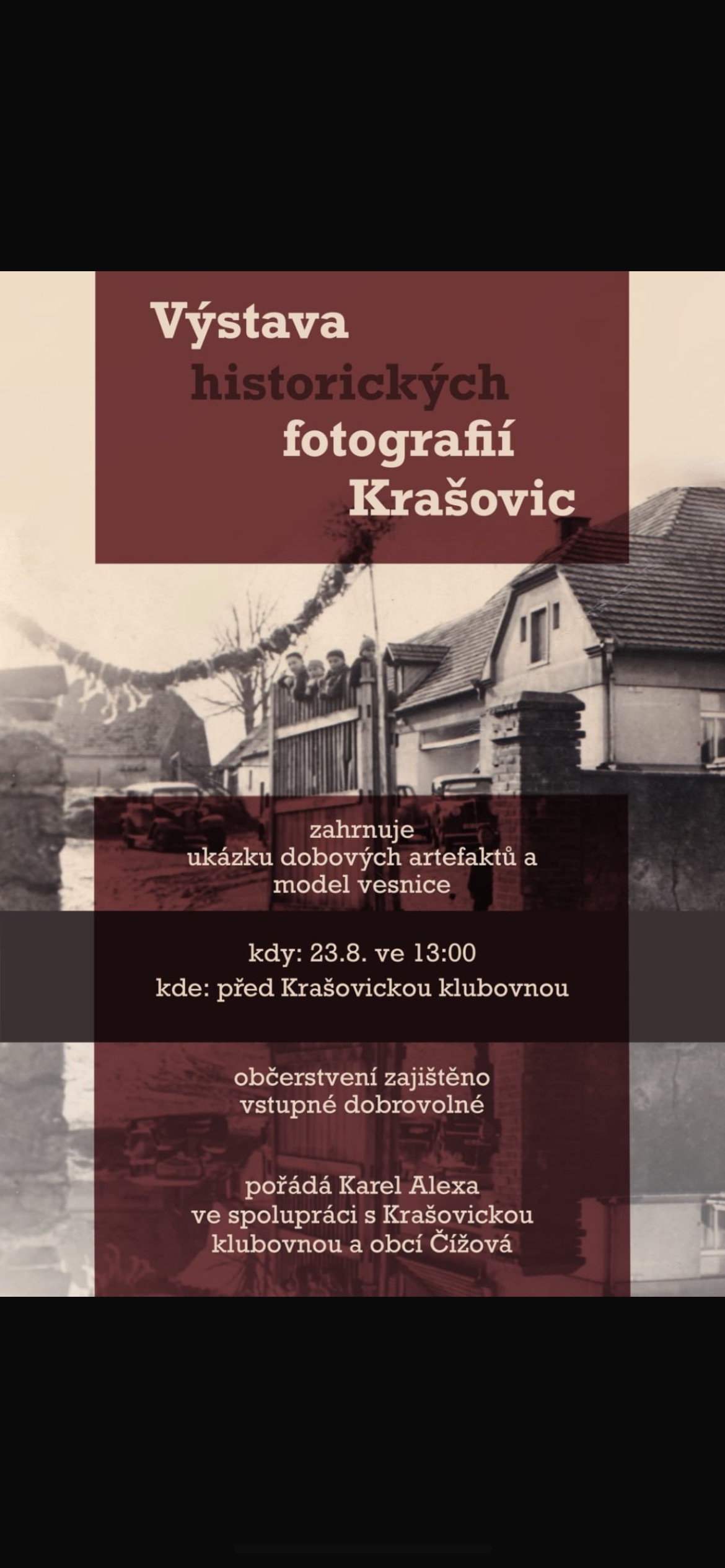 Výstava historických fotografií Krašovic se koná v prostoru před klubovnou.
