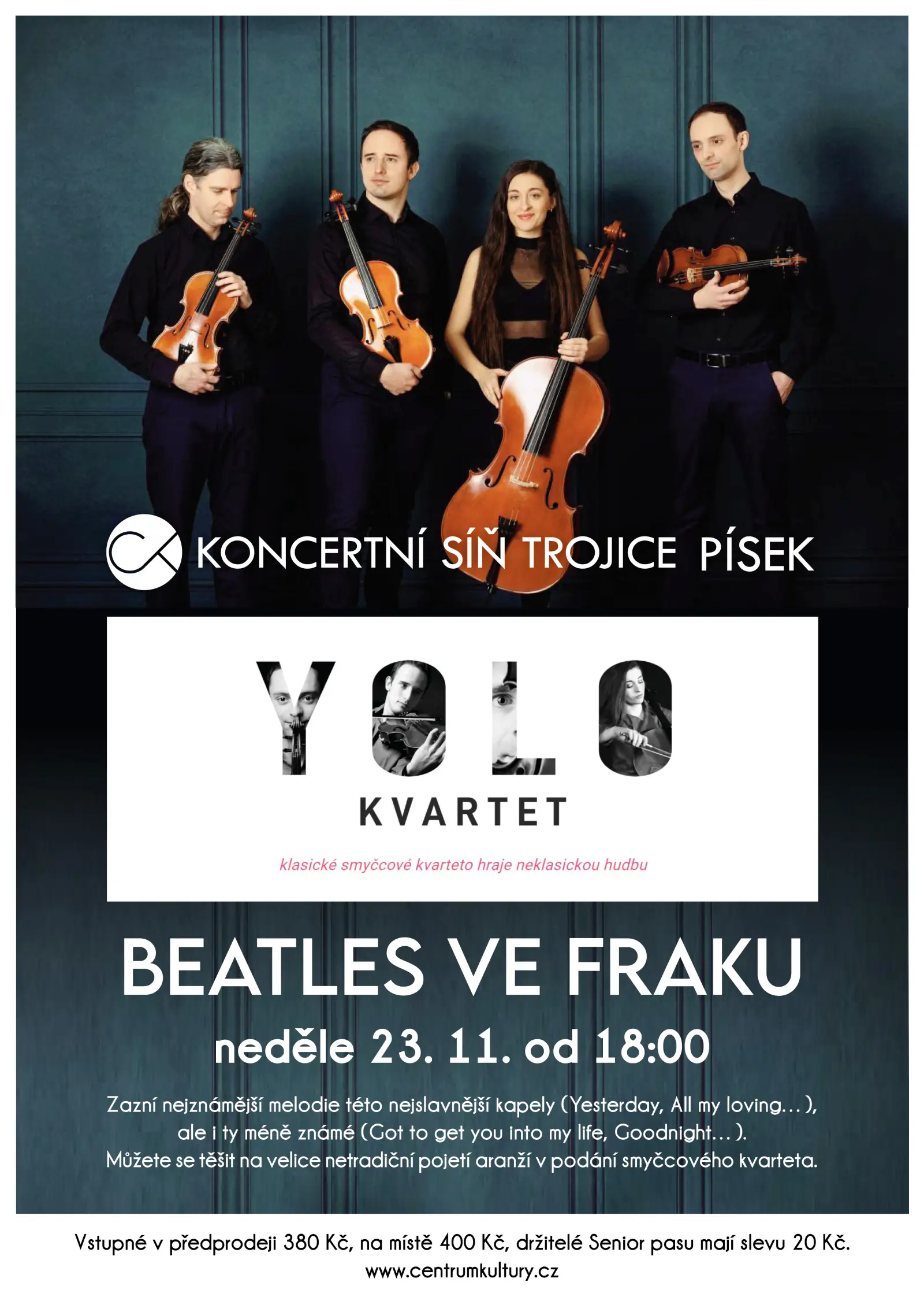 YOLO KVARTET vystoupí poprvé v Písku s koncertem„Beatles ve fraku“. Zazní nejznámější melodie této nejslavnější kapely (Yesterday, All my loving…), ale i ty méně známé (Got to get you into my life, Goodnight…). Představíme vám je, i jednotlivé komentáře, jak písně vznikaly. Můžete se těšit i na velice netradiční pojetí aranží v podání smyčcového kvarteta.