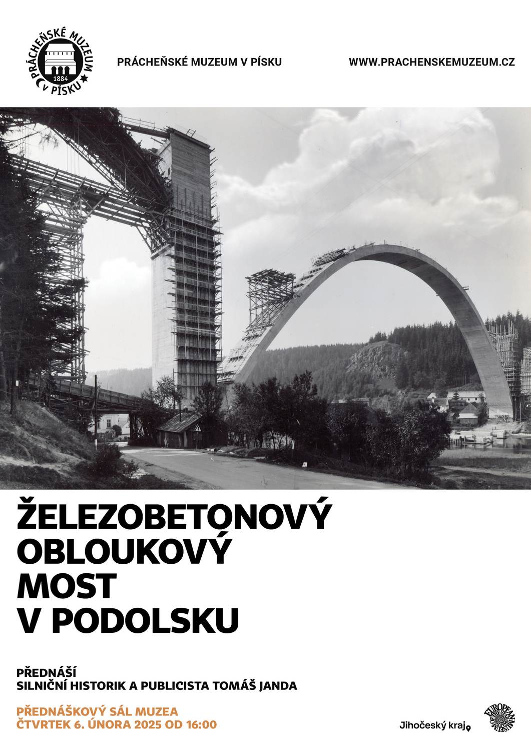 Přednáška představí vrchol českého mostního stavitelství 1. poloviny 20. století. Řeč bude o Železobetonovém obloukovém mostu v Podolsku, který byl vystaven v letech 1923 – 1943. Muzeum o něm v minulosti připravilo úspěšnou výstavu, jejímž kurátorem byl silniční historik a znalec Tomáš Janda. Právě on do Písku 6. února dorazí vybaven dobovými fotografiemi, plány a dalšími zajímavostmi.