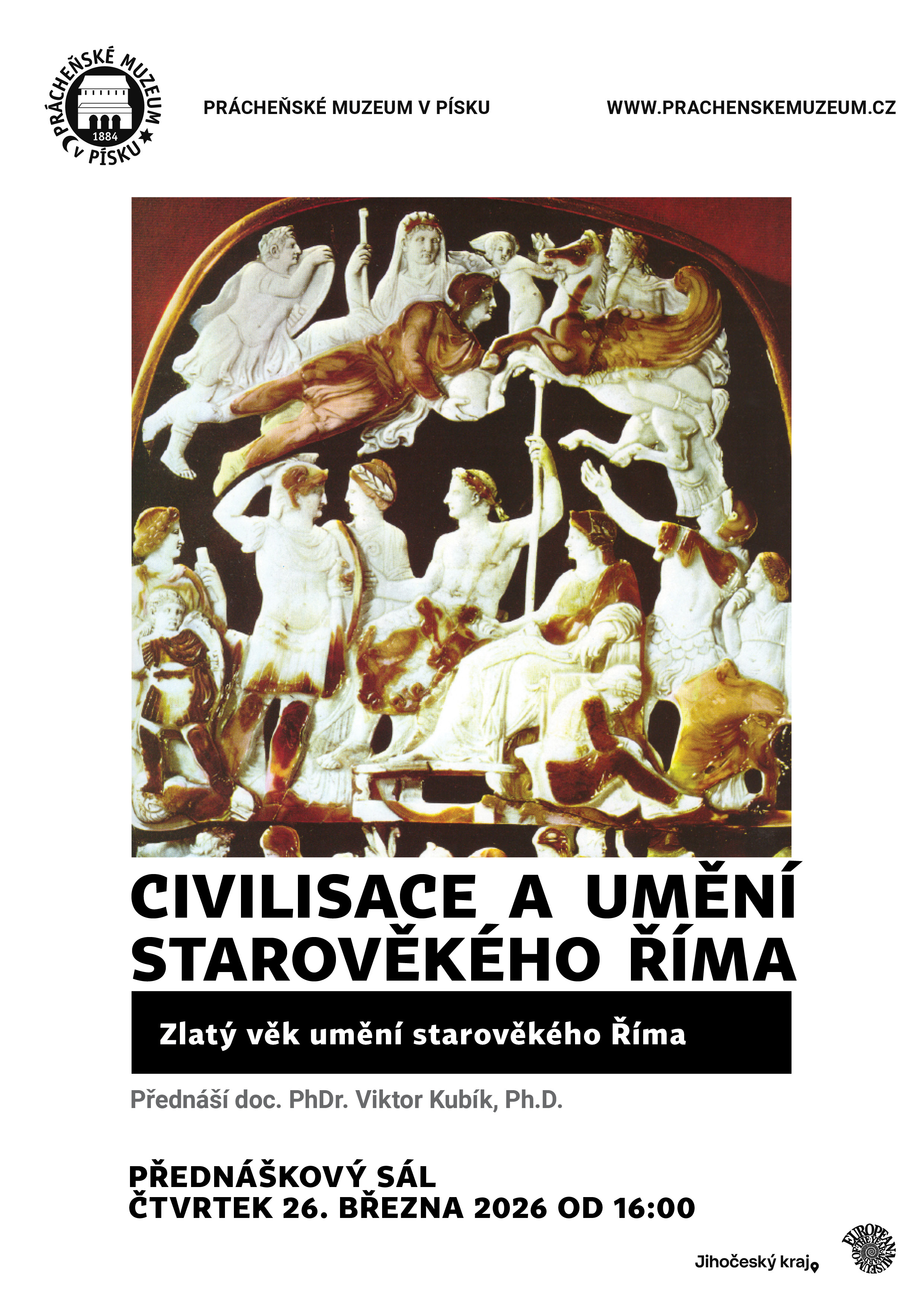 Historik umění Viktor Kubík letos do Písku přiváží cyklus o starověkém římském umění. 26. 3. bude řeč o Zlatém věku umění starověkého Říma. Přelom tisíciletí dal vzniknout monumentálním dílů architektury, sochařství, technicky dokonalým výtvorům užitého umění a malířství, které změnily vývoj evropské civilizace a na dlouho se staly nedostižnými vzory. Římský praktický způsob uvažování se spojil s helénistickým hédonismem a výsledkem bylo nejúžasnější umění starověku.